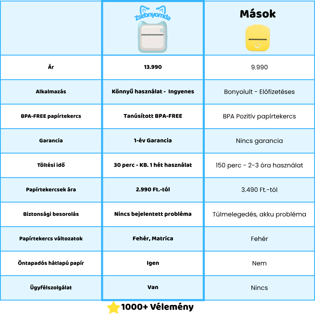Igen, az! A Zsebnyomda USB töltővel érkezik, így nem kell folyamatosan elemeket vásárolnod!
