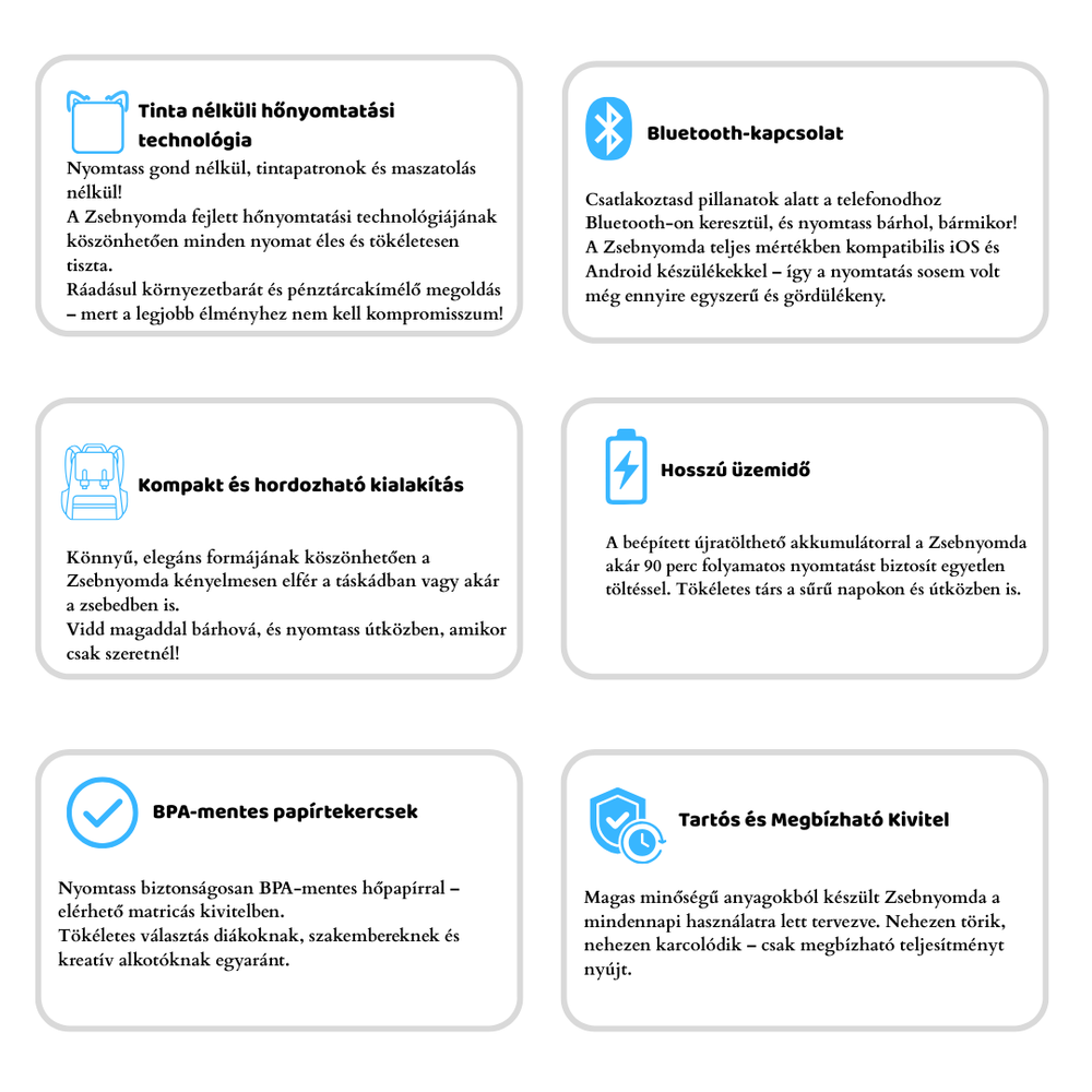 zsebnyomtató mindenkinek igényeit kielégíti. Bármi legyen is a szereped, mini nyomtatónk nélkülözhetetlen eszköz lesz ötleteid kifejezéséhez.